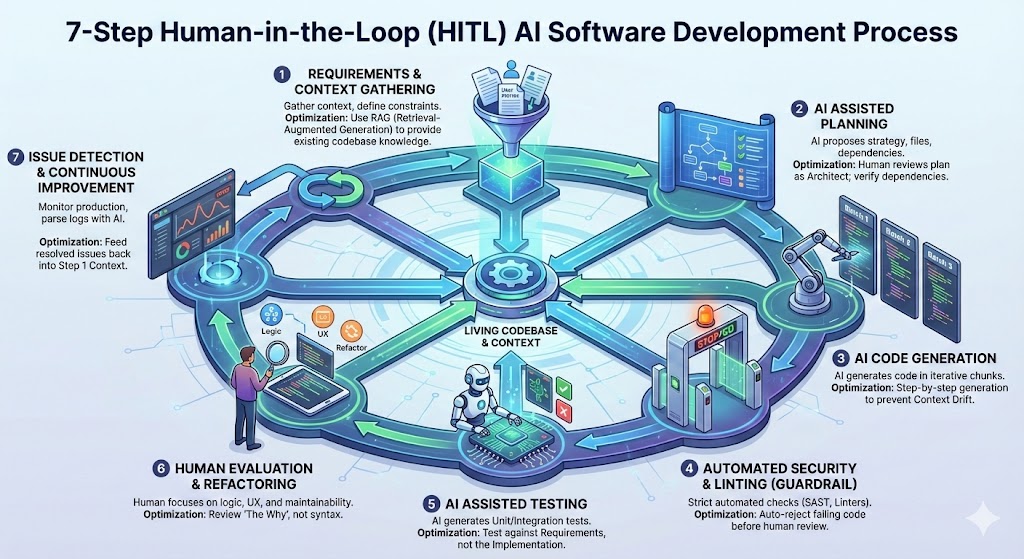 This is the detailed breakdown of the optimized 7-step Human-in-the-Loop (HITL) software development lifecycle. This structure balances the speed of AI with the necessity of human oversight and automated safety.