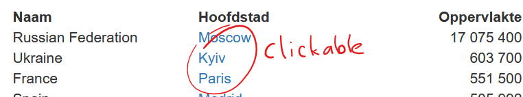 Maak elke hoofdstad in het overzicht dat je bij opdracht 1 hebt gemaakt clickable. Als je op de link klikt dan open je het overzicht van de stad, bijvoorbeeld http://localhost:8080/city/view?id=5 .